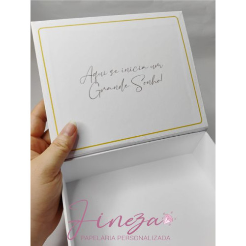 Na tampa interna você poderá colocar a mensagem que quiser, um convite ou um agradecimento, de acordo com seu objetivo, é só nos enviar sua mensagem!